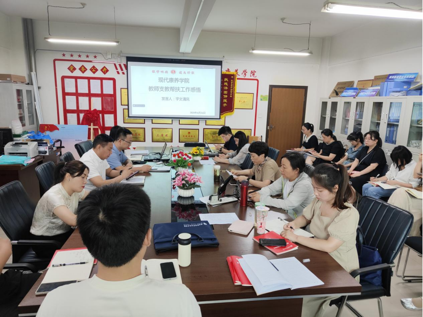 6月26日下午,现代康养学院在409会议室举行赴白河职教中心支教教师工作感悟分享会,学院全体教师线上线下参加会议。