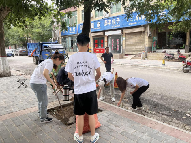 回去的路上,遇到环卫工人,队员们纷纷上前,帮助他们捡落叶、纸屑和烟头。