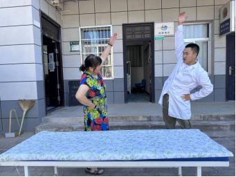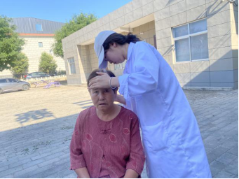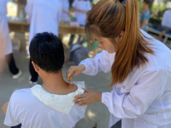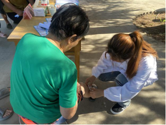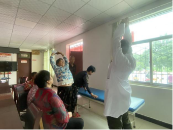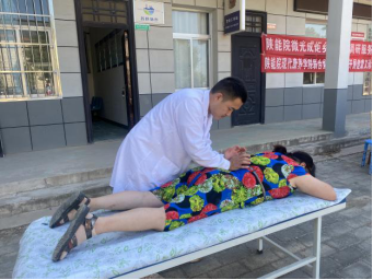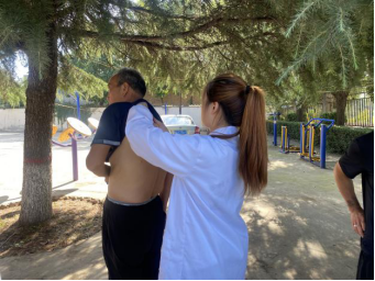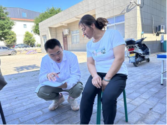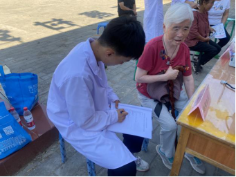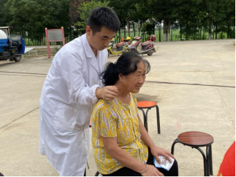 村民到齐后,实践队开始义诊。团队开展健康知识宣讲和常见病防治的科普,发放健康知识宣传册,帮助村民测量血压、血糖,为群众刮痧、按摩理疗,问诊后对症进行三伏贴的贴敷并讲解注意事项。期间,队员为排队等候的村民进行《农村医疗卫生状况调研问卷》的填写。最后,队员带领大家一起做颈椎保健操。