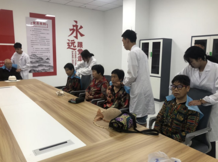 “这种力道可以吗?有什么不舒服的您随时说。”学生负责人王佳乐在给老人按摩时耐心时询问到。实践团成员在服务大厅和会议室内为老人提供康复按摩、艾灸治疗等服务,赢得了现场老人的连连称赞。张高致老人今年69岁,因年轻时长期伏案工作,再加上现在手机对生活的影响,颈椎常年僵硬不适,得知今天有大学生志愿者到家门口开展康复按摩和艾熏服务早早地就来到了活动现场,并对志愿者们的专业技术和奉献精神赞不绝口。
