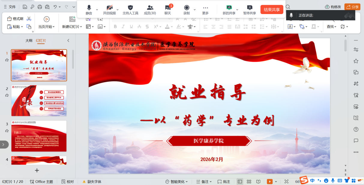 为进一步提升药学专业学生的就业能力与职业规划水平,推动毕业生更加充分、更高质量就业,2月5日,我院组织开展了药学专业就业指导专题活动。活动紧密围绕当前医药行业发展趋势和岗位实际需求展开,引导学生认清形势、找准定位、科学规划未来职业发展方向。