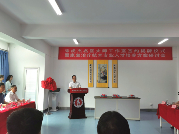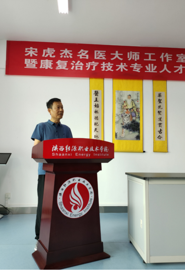 为推进我校双高建设,增加多层次的师承教育项目,扩大师带徒范围和数量,积极发挥临床名医大师的重要作用,2021年5月26日,我校在第二实训楼302康复专业实训室隆重举行了宋虎杰名医大师工作室签约揭牌仪式暨康复治疗技术专业人才培养方案研讨会。西安中医脑病医院院长宋虎杰、副院长杜晓刚等一行4人受邀出席,陕西能源职业技术学院校长朱忠军、副校长赵新法、教务处长牛西武、医学院党政领导及康复专业全体教师和20名学生代表等参加了此次仪式,仪式由副校长赵新法主持。