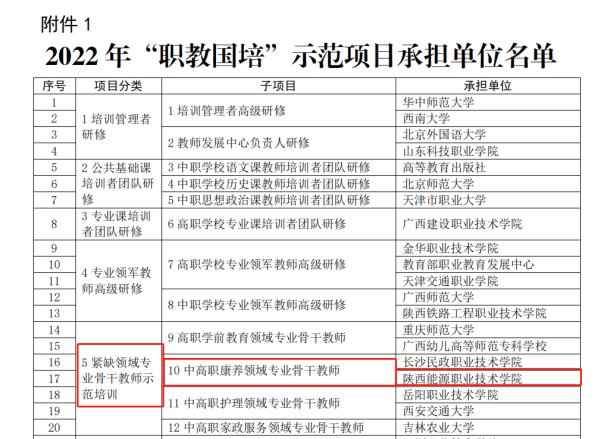 据悉,为健全职业教育教师培训体系,发挥国家级职业教育教师培训的高端引领和示范带动作用,教育部利用中央部门预算资金,从2022年起新设立“职教国培”示范培训项目。今年示范项目共设置培训团队研修、教师培训、校长(书记)培训3大类8个项目24个子项目,经单位申报、专家评审,全国共确定承训单位43家,其中普通本科高校21所、高等职业院校17所、出版机构3家、研究机构2家,陕西省共有1所普通本科院校和2所高等职业院校入选,我校为其中之一。