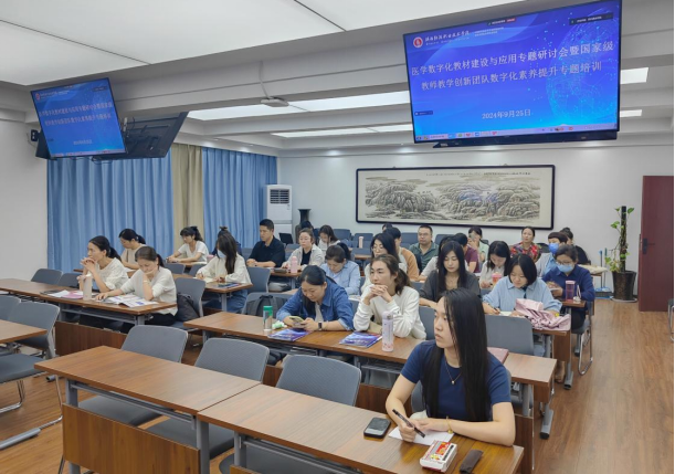 为深入贯彻落实党的二十大报告关于“推进教育数字化”重大战略部署,借助信息技术手段,创新康养人才培养,建设高质量数字化教材,9月25日下午,现代康养学院在第二会议室举办医学数字化教材建设与应用专题研讨会暨国家级教师教学创新团队数字化素养提升专题培训。人民卫生电子音像出版社闫然主任、刘爱菊主任一行等来我院做专题讲座,现代康养学院与护理学院全体教师(临潼校区教发中心)以线上线下相结合的方式参加此次培训,会议由现代康养学院院长任春晓主持。