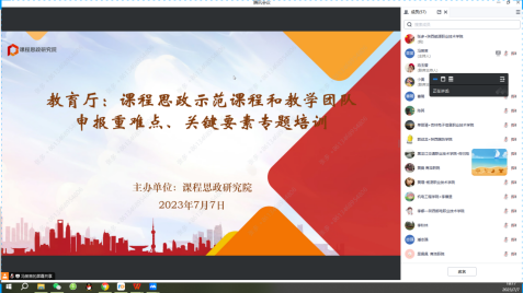 为进一步提升教师课程思政教学能力,为省级和国家级课程思政示范课程建设与申报奠定坚实基础,7月7日晚,我院参加由陕西省教育厅举办的课程思政示范课程和教学团队申报专题培训讲座。现代康养学院党总支书记唐恭贺、副院长任春晓及全体教师以“线上+线下”结合的方式参加本次专题培训。