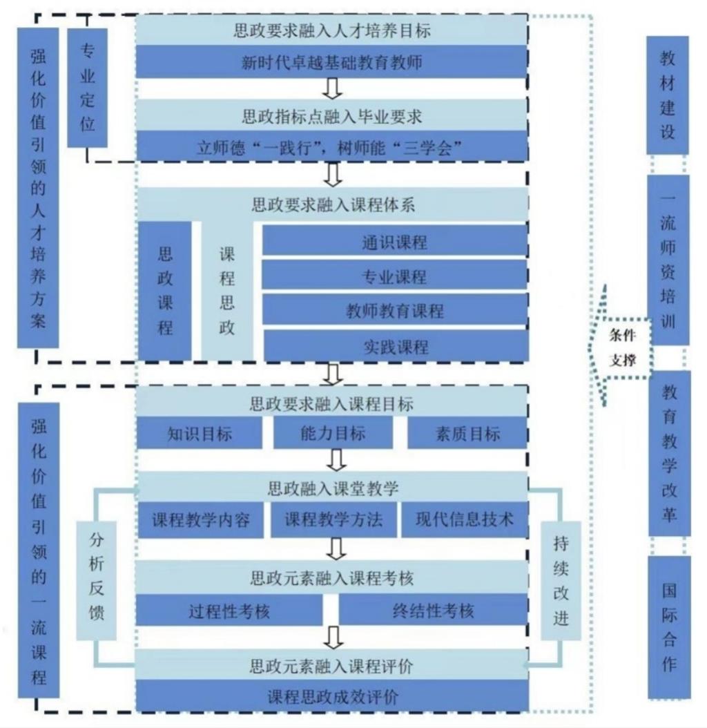 学校坚持价值引领,将师德内容有机融入人才培养各环节,打通内在关联的逆向设计逻辑主线,构建“显隐融合、知行合一、五育并举、特色鲜明”的课程体系,发挥通识课程、专业课程、教师教育课程、实践课程的育人功能。
