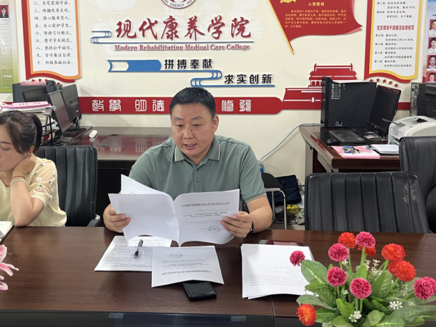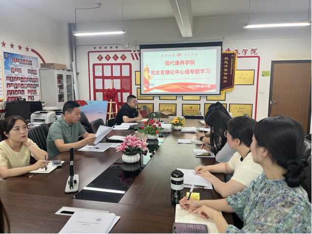 6月24日上午,现代康养学院党总支理论学习中心组在办公楼四楼409室召开2024年专题学习会,全体坐班人员、各教研室主任参加学习会,学习会由学院党总支书记唐恭贺主持。