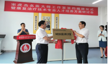 朱忠军校长(左一)与宋虎杰教授共同为名医大师工作室揭牌