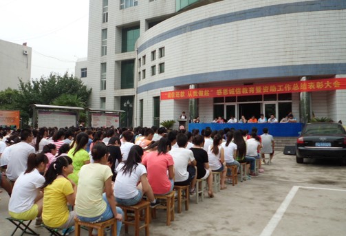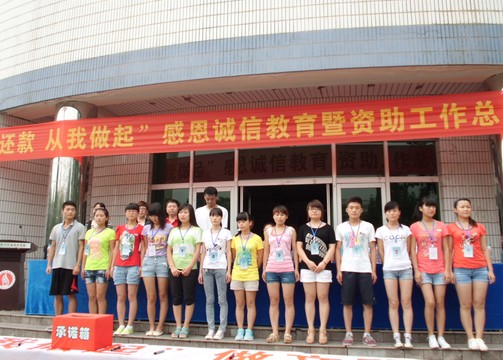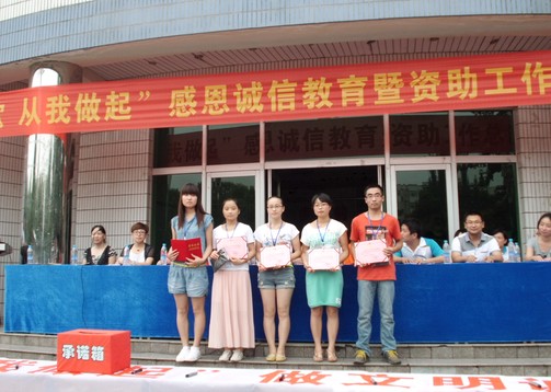 2013年7月2日下午5点,由学生处与院团委联合主办的“诚信还款,从我做起”感恩诚信教育暨资助工作总结表彰大会在临潼校区图书楼前举行。学生处、院团委相关领导,勤工助学用人部门负责人及受资助的300多名学生代表出席此次活动。