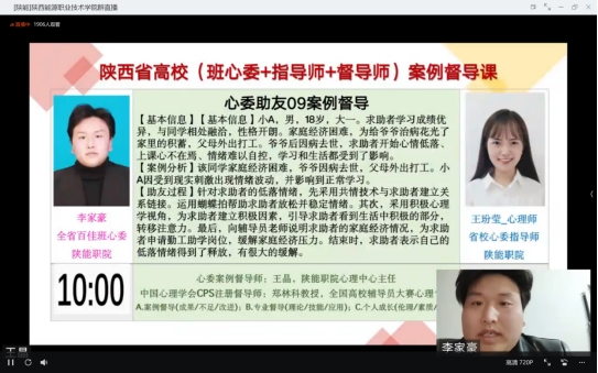 12月11日晚,“陕西省班级心理委员和指导师心理助人技能培训及案例督导——陕能院省级标准心理健康教育中心专场”线上督导顺利进行。我校十佳心理委员、康养学院临床2101班高雨卓,全省百佳心理委员、煤化学院机电2108班李家豪分享助人案例,校级十佳心理委员指导师、康养学院辅导员田冲,全省百佳心理委员指导师、心理中心咨询师王玢莹进行指导。学生工作部心理健康教育中心主任王晶进行督导。陕西省高校心理素质教育研究会会长、中国心理学会注册督导师郑林科作最终点评督导。