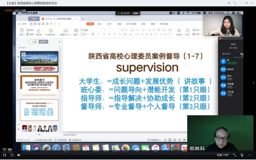 郑林科高度肯定我校搭建的四级网络心理育人体系,认为学校心理委员培养工作扎有效,能够运用“第一只眼”及时准确地察觉同学们存在的心理问题,能很好地运用共情技术有感受、有爱心地对同学进行朋辈辅导;指导教师能够从专业角度对班级心理委员进行有效指导,师生协作亲密,育心防线稳固。最后,他指出,班级心理委员是心理育人工作的重要的朋辈力量,从心理障碍识别、不同角度分析案例,多元化视角理解案例、对咨询目标的把握、未来咨询的方向等方面给予专家督导。
