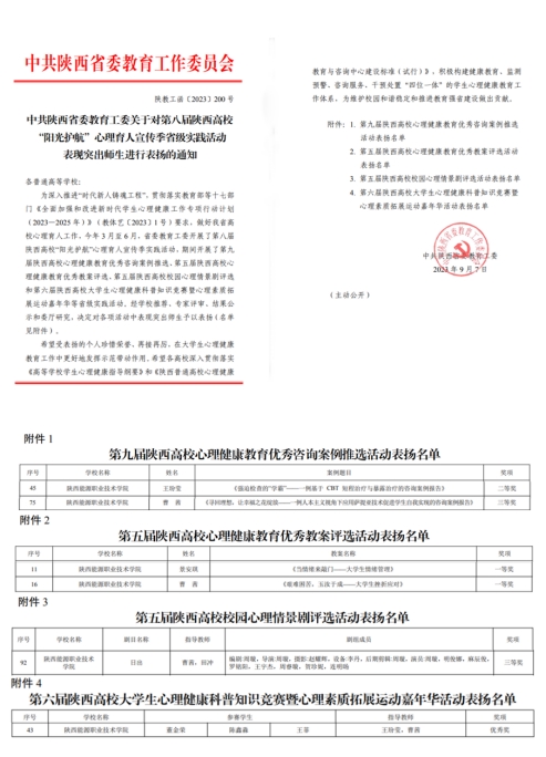 近日陕西省委教育工委公布了第八届陕西高校“阳光护航”心理育人宣传季省级实践活动的表彰院校,我校师生共获得荣誉6项,一等奖2项,二等奖1项,三等奖2项,优秀奖1项。