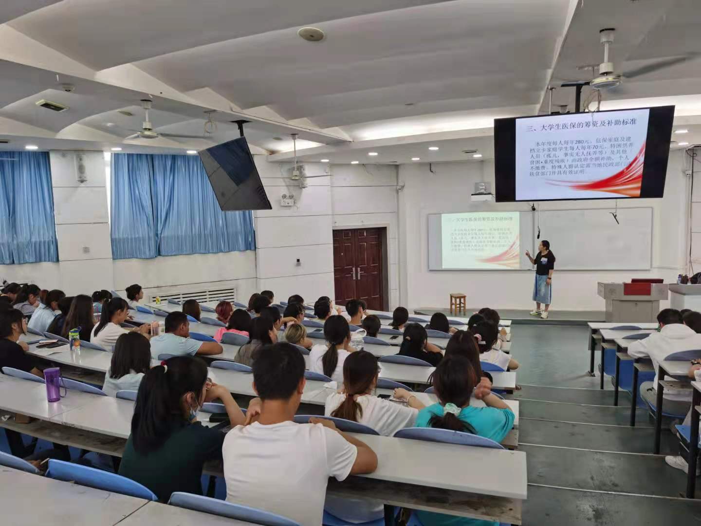 学生资助管理中心主任冯帅介绍了我校奖、助、贷、勤、补、免六位一体的资助体系,详细解读了国家奖学金、国家励志奖学金、国家助学金、生源地信用助学贷款、服兵役国家教育资助、校内奖学金等资助政策。干事卢锦瑶就大学生医保政策进行了详细解读,具体介绍了大学生在校期间为何参保,如何参保以及参保后的就医报销流程。