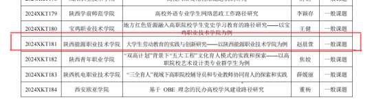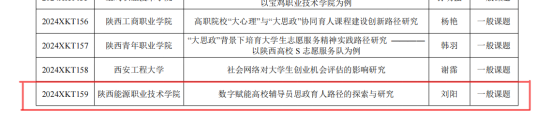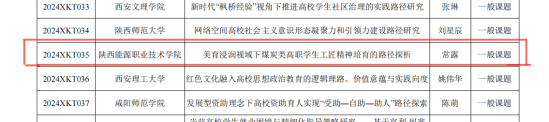 6月5日,中共陕西省委教育工委发布了《关于公布2024年度陕西高校学生工作研究课题立项名单的通知》,我校煤化学院辅导员常露主持的《美育浸润视域下煤炭类高职学生工匠精神培育的路径探析》、学生处学生资助管理中心干事刘阳主持的《数字轼能高校辅导员思政育人路径的探索与研究》、康养学院学工办主任赵晨萱主持的《大学生劳动教育的实践与创新研究—以陕西能源职业技术学院为例》等3项学生工作课题研究项目获得省级立项。