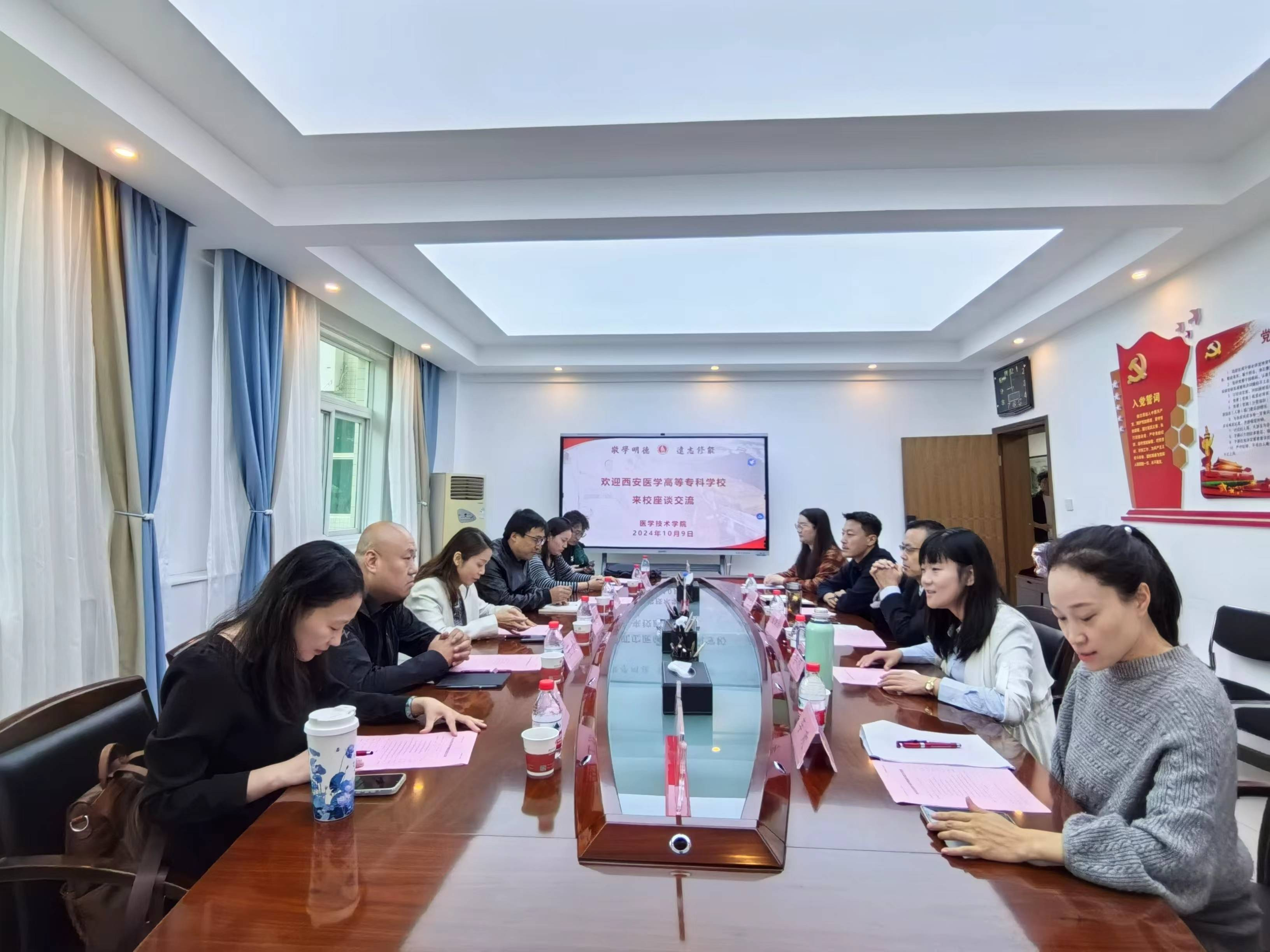 10月9日上午,西安医学高等专科学校教务处副处长雍妹,校企合作处副处长王力,口腔医学院党总支书记马志发、院长王弦、技能大赛指导老师孟玺一行5人来校座谈交流。医学技术学院党政领导、口腔教研室教师参加,学院副院长李蕊主持会议。