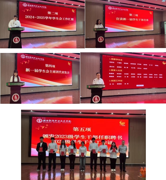 大会在庄严的国歌声中拉开帷幕。学生会副主席雷晓峰首先对2024 - 2025学年学生会工作进行全面汇报。随后,学工办主任蒋文宣读新一届学生干部名单,并向新一届学生干部表示祝贺。学生会副主席张锦泽代表学生会主席团发表就职表态,展现工作决心。党总支书记巩明发为2023级学生干部颁发聘书、为2024级发放工作证。党总支副书记张多宣读优秀干事名单并颁奖。