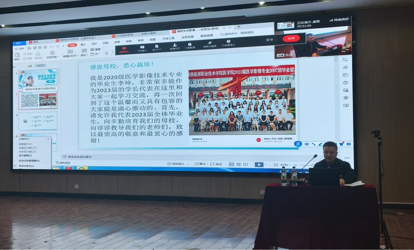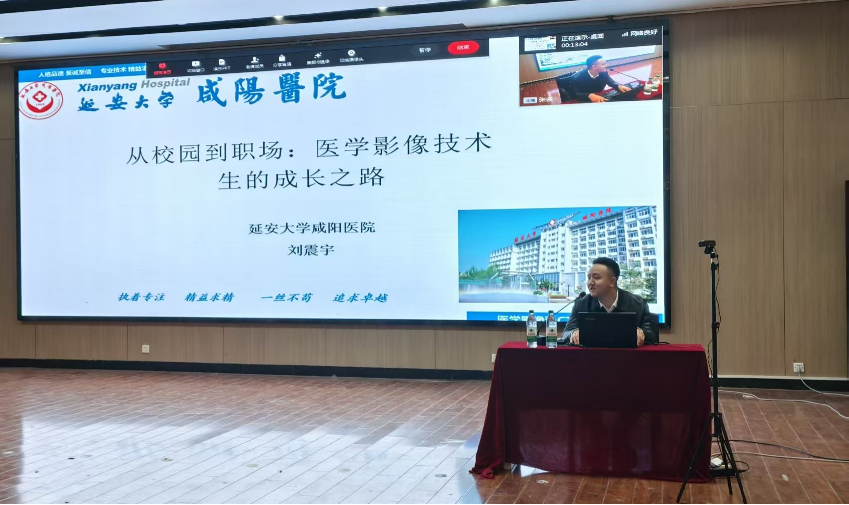 11月18日,医学技术学院在第一实训楼六楼报告厅成功举办第二期“承榜样之光,拓就业之路——优秀校友与你面对面”职业生涯规划教育暨就业教育宣讲会。本次宣讲会特邀延安大学咸阳医院刘震宇与陕西乐思康科技有限公司李坤两位优秀校友倾情分享,采取线上线下相结合方式进行,医学技术学院党总支副书记张多、班主任以及全体医学影像技术专业学生参会,活动由张多主持。