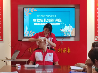 实践团向在场护工进行了头顶部出血、左(右)踝关节扭伤两项内容的知识普及和现场应急处理演示,深入浅出的讲解激发了护工们的学习兴趣,护工们踊跃上台尝试,进行实操,现场学习气氛十分活跃,效果良好。