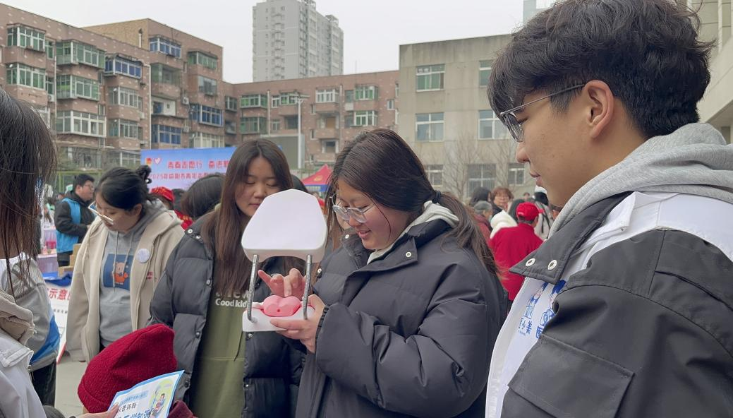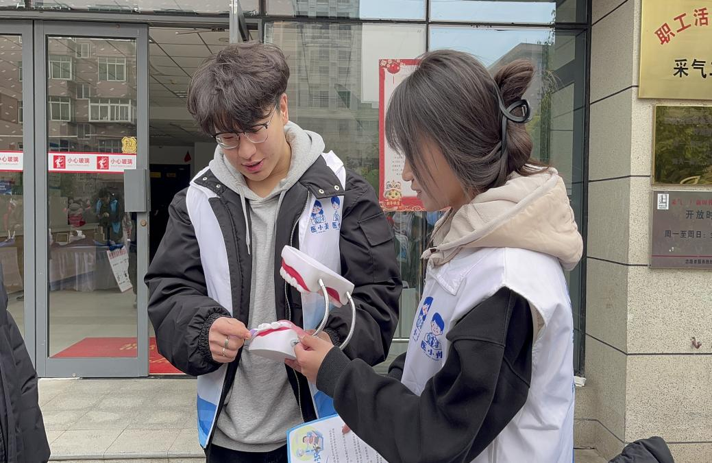 当日,志愿服务队的同学们为社区老人进行血压血糖测量,口腔专业的同学们则化身口腔健康 “小卫士”,专注于向周边居民传授科学的巴氏刷牙法。他们手持牙齿模型与牙刷,现场演示正确刷牙步骤。“牙刷与牙长轴呈 45 度角,轻轻深入龈沟,注意力度与方向……” 同学们一边示范,一边详细讲解,让居民们深刻认识到正确刷牙对口腔健康的重要性。