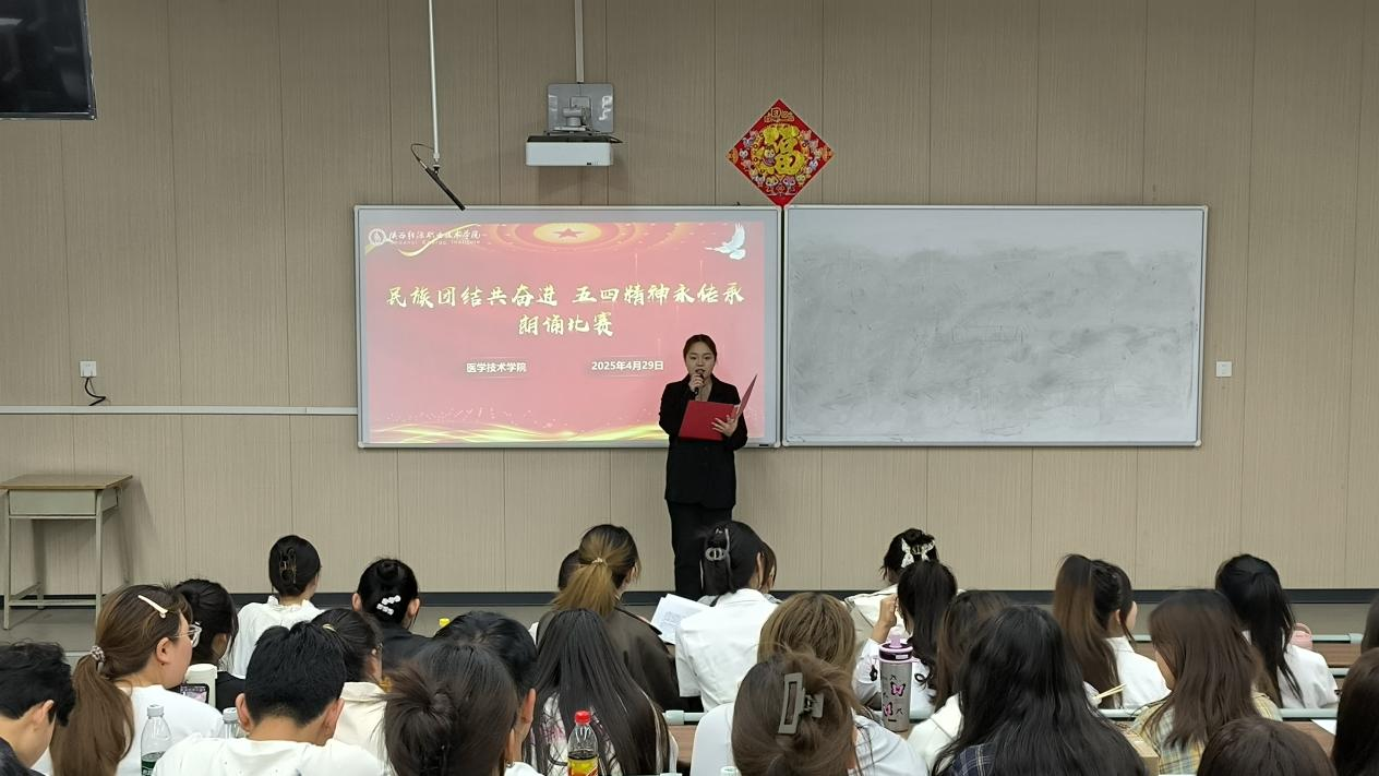 4月29日中午,医学技术学院在临潼校区教学楼102教室举办“民族团结共奋进,五四精神永传承”朗诵比赛。学院辅导员及各年级学生共计100余人参加活动。