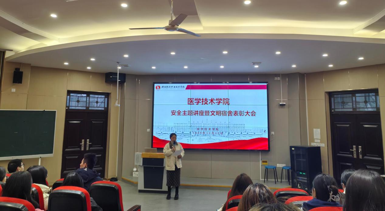 医学技术学院于2025年12月15日在临潼校区105教室召开安全主题讲座暨文明宿舍表彰大会。2024、2025级宿舍舍长及各班生活委员100余人参加会议。